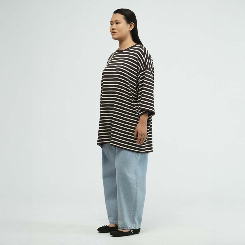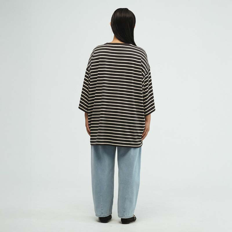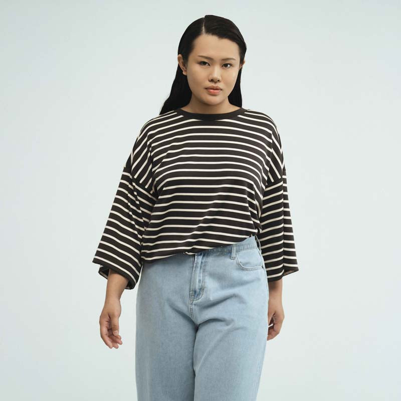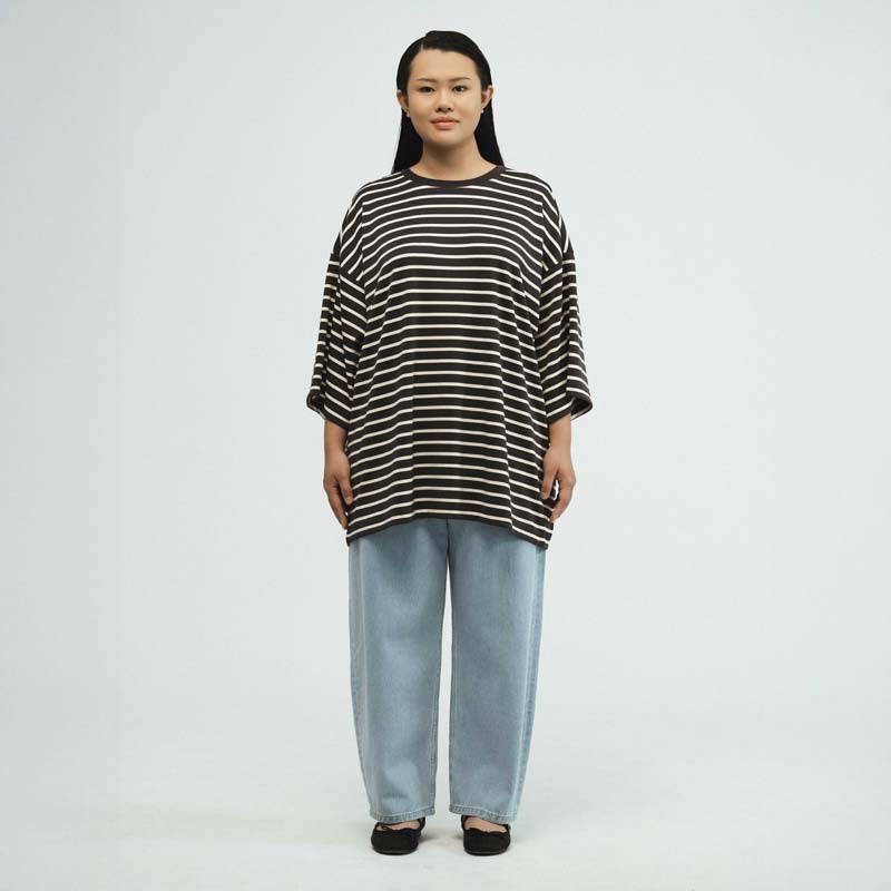 Discover effortless style with our Oversize Stripe Tee, crafted for versatile sizing that adapts to your frame.  Featuring a classic crew neck, straight sleeves, and loose-fitting cut, this tee delivers comfort without compromise.