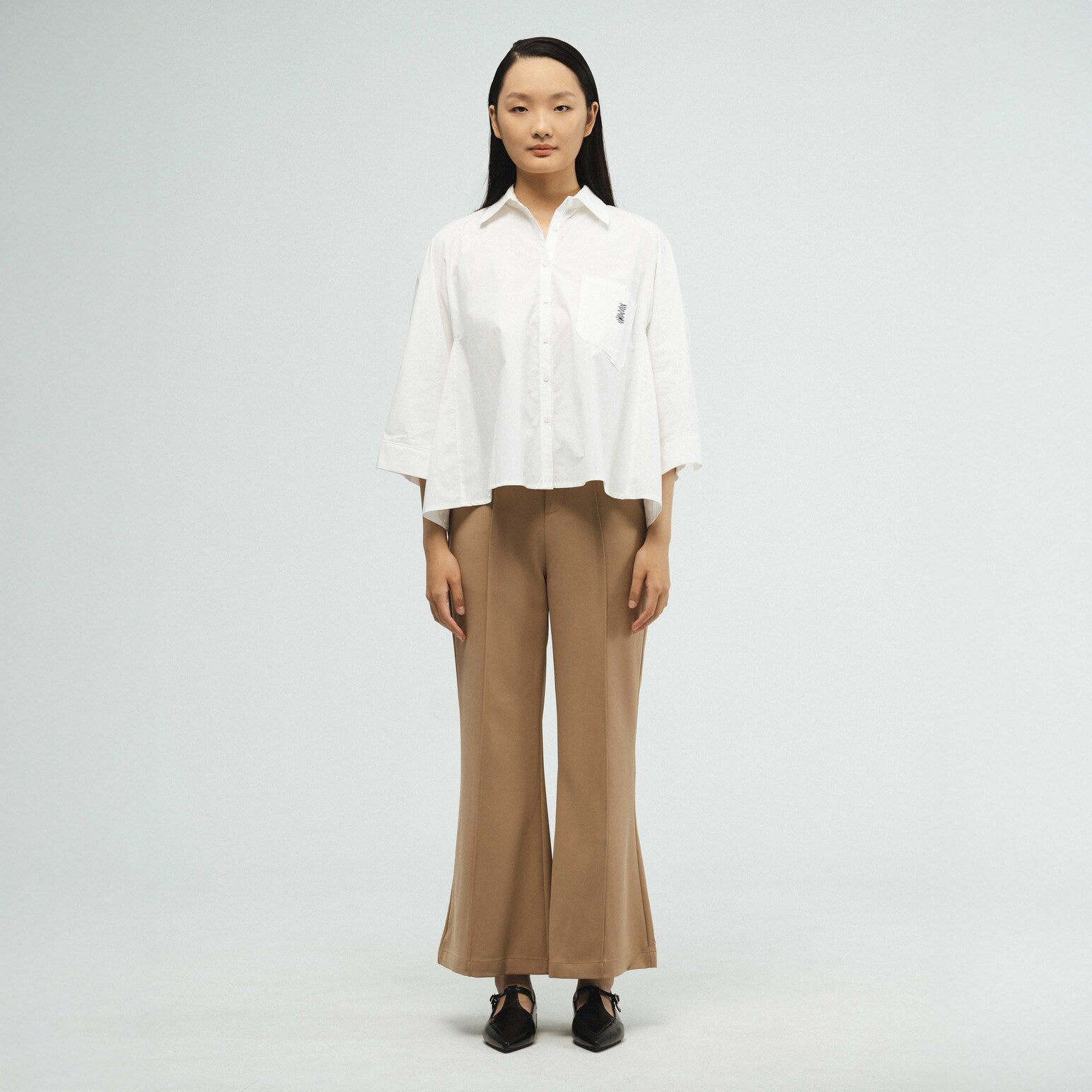 Featuring a relaxed silhouette with three-quarter dolman sleeves and a classic collared neckline. The straight hem and front button opening create a timeless look that transitions seamlessly from casual to polished.