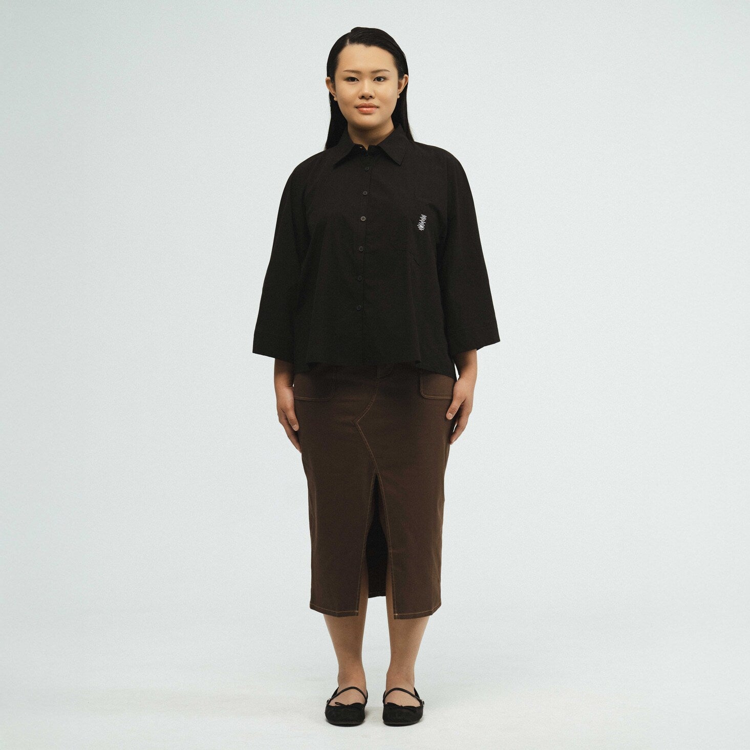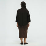 The three-quarter dolman sleeves create a flattering, contemporary look, while the collared neckline and front button opening offer timeless sophistication.